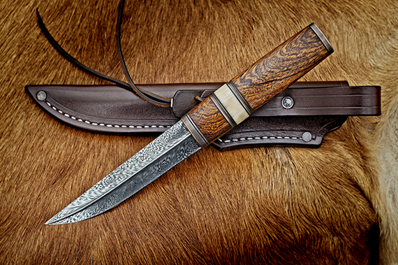 Leopardwood Damascus Feather Puukko knife