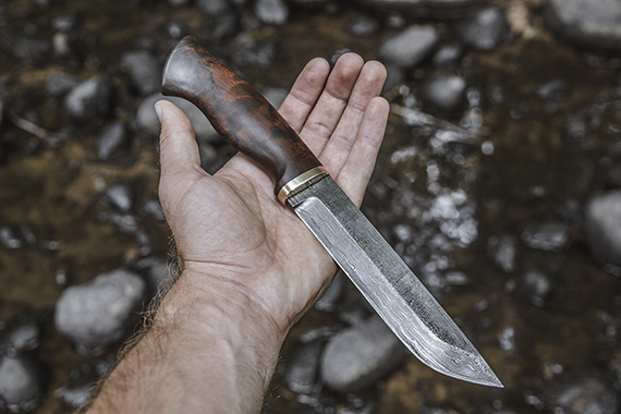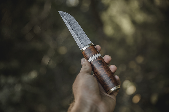 Blade material: Pattern welded Damascus steel. 3 laminates - milder sides, harder middle piece for the edge. 400 layers for each laminate.